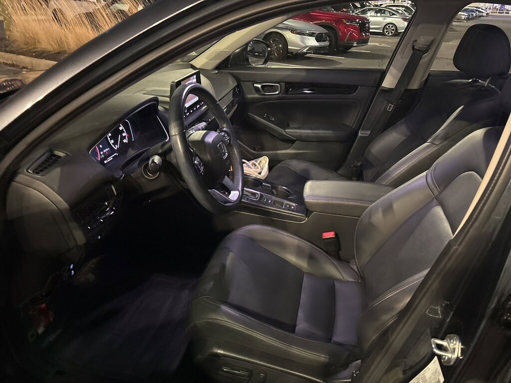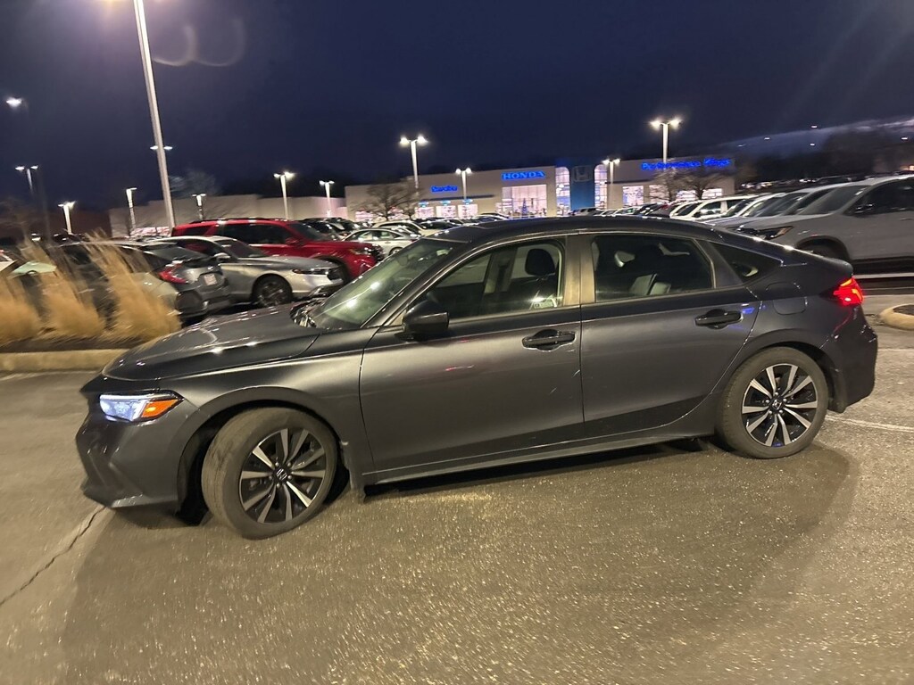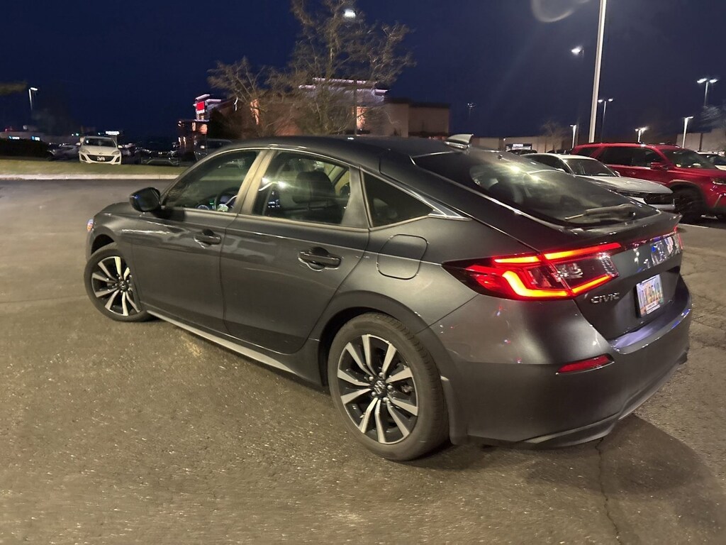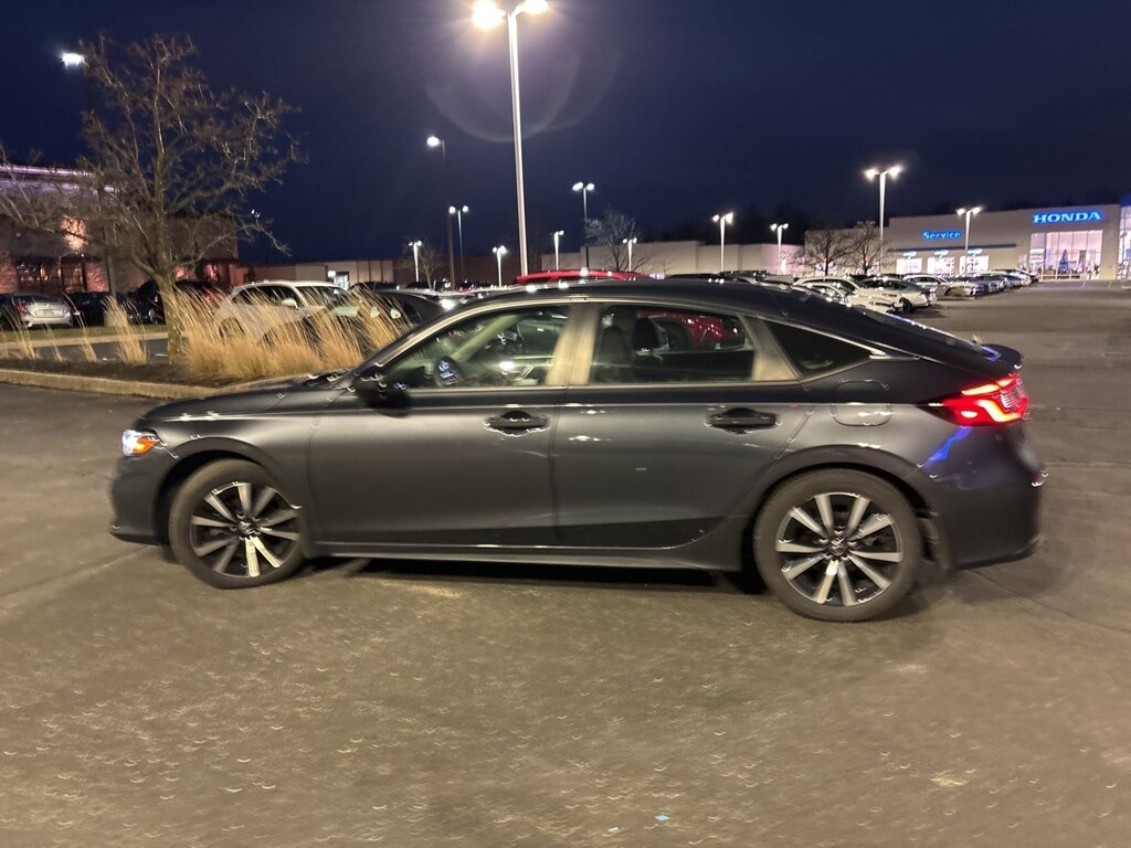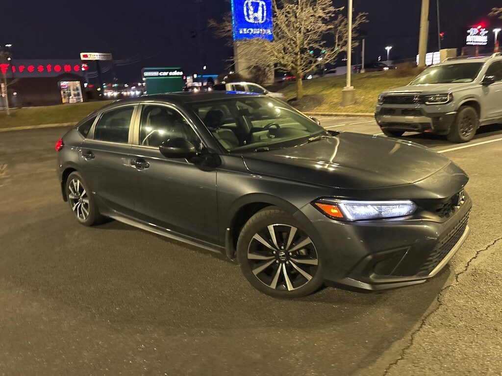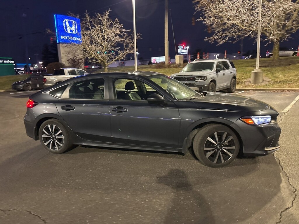This stunning 2023 Honda Civic Hatchback EX-L features a beautiful Meteorite Gray Metallic exterior and a Black interior.