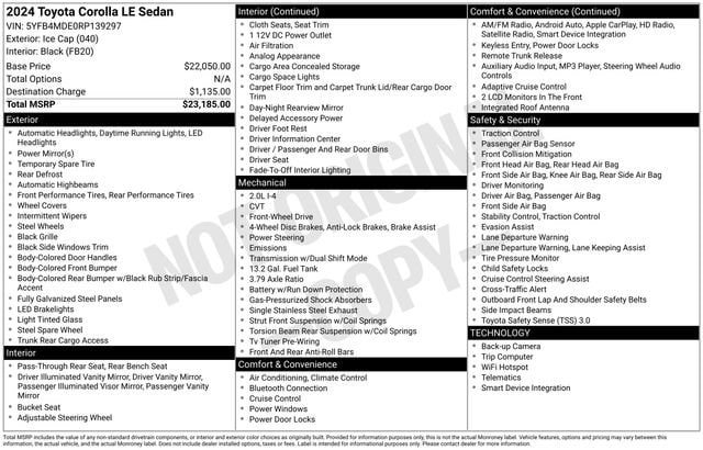Certified. CARFAX One-Owner. Odometer is 33220 miles below market average! 32/41 City/Highway MPG Clean CARFAX. Ice Cap 2024 Toyota Corolla LE FWD CVT 2.0L I4 DOHC 16V