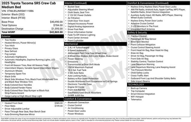 Certified. CARFAX One-Owner. Clean CARFAX. Black 2025 Toyota Tacoma SR5 4WD 8-Speed Automatic 2.4L 4-Cylinder