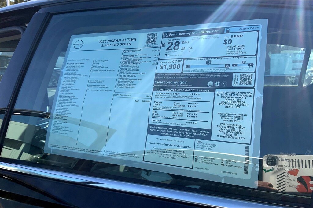 $4,183 off MSRP! Jeff Wyler Kings Nissan is very proud to offer this outstanding-looking 2025 Nissan Altima 2.5 SR in Super Black Clearcoat. Well equipped with: SR Premium Package (2-Way Driver Power Lumbar Support, 4-Way Power Passenger Seat, Dual Zone Automatic HVAC, Heated Front Seats, Leather-Appointed Seat Trim, NissanConnect, Premium Sport Interior Finishers, Remote Engine Start w/Intelligent Climate Control, and Single Panel Moonroof), CVT with Xtronic, 4-Wheel Disc Brakes, 6 Speakers, ABS brakes, Air Conditioning, Alloy wheels, AM/FM radio: SiriusXM, Auto High-beam Headlights, Blind Spot Warning, Body-Colored Splash Guards, Brake assist, Bumpers: body-color, Delay-off headlights, Driver door bin, Driver vanity mirror, Dual front impact airbags, Dual front side impact airbags, Electronic Stability Control, Four wheel independent suspension, Front anti-roll bar, Front Bucket Seats, Front Center Armrest, Front reading lights, Fully automatic headlights, Illuminated entry, Illuminated Kick Plates, Knee airbag, Leather Shift Knob, Low tire pressure warning, NissanConnect featuring Apple CarPlay and Android Auto, Occupant sensing airbag, Outside temperature display, Overhead airbag, Overhead console, Panic alarm, Passenger door bin, Passenger vanity mirror, Power door mirrors, Power driver seat, Power steering, Power windows, Radio data system, Radio: AM/FM Audio System, Rear anti-roll bar, Rear Parking Sensors, Rear reading lights, Rear seat center armrest, Rear side impact airbag, Rear window defroster, Remote keyless entry, Security system, Speed control, Speed-sensing steering, Speed-Sensitive Wipers, Split folding rear seat, Sport Seat Trim, SR Floor Mats/Trunk Mat/Hideaway Nets, Steering wheel mounted audio controls, Tachometer, Telescoping steering wheel, Tilt steering wheel, Traction control, Trip computer, Trunk Organizer Tray, Unique Sport Seats, Variably intermittent wipers, and Wheels: 19" Sport Machined Alloy. 27/37 City/Highway MPGWyler Family First Package Includes: NanoCure Appearance Protection: Exterior & Interior Chemical Sealant Applied to Protect Against Environmental Hazards (7 Year Warranty Coverage). Pulse- Rear end Collision Avoidance System Theft Deterrent Strategy gives you 5 Years of Coverage against vehicle Theft, Offering up to a $5,000 benefit. Used vehicles 10 years of age or newer with less than 100,000 miles are eligible for the Wyler Assurance Program, but eligible vehicles must pass our reconditioning process and multi-point inspection. Provided the vehicle passes inspection, vehicles will be eligible for the 6 month/6,000 mile limited warranty. The 6 month/6,000 mile limited warranty is NOT available on AS-IS vehicles, wholesale vehicles, lease buyback/pass-thru vehicles or un-inspected vehicles. Note that this program can also apply to vehicles where the remaining factory coverage is less than 6 months or 6,000 miles. Please check the Federal Trade Commission (FTC) Buyers guide on the vehicle for full details as to whether or not warranty coverage may apply. Contact Dealer for additional details. The Wyler Assurance 6 month/6,000 Mile limited warranty ends 6 months from the date of the Retail Purchase Agreement (BUYERS ORDER) or when the vehicle's odometer registers 6,000 additional miles to the mileage listed on the BUYERS ORDER, whichever comes first. Your Deductible - The warranty holder on your contract pays the first $100 of each covered repair.
