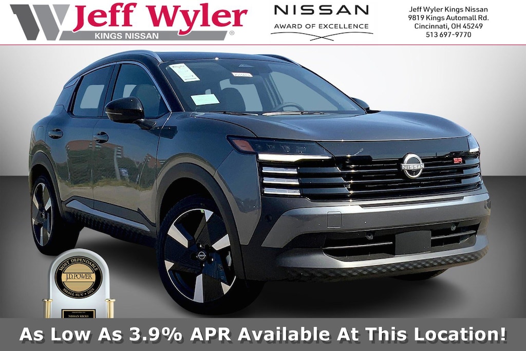 $4,942 off MSRP! Jeff Wyler Kings Nissan is excited to offer this good-looking 2025 Nissan Kicks SR in Gun Metallic/Super Black. Well equipped with: SR Premium Package (Bose 10 -Speaker Audio, Driver Seat-Mounted Supplemental Air Bag, Heated Front Seats, Heated Steering Wheel, Panoramic Moonroof, Rain Sensing Wipers, and Remote Engine Start), 17" Alloy Wheels, 19" Alloy Wheels, 2-Tone Paint, 4-Wheel Disc Brakes, 6 Speakers, ABS brakes, Air Conditioning, Alloy wheels, AM/FM radio: Sirius, Auto High-beam Headlights, Automatic temperature control, Brake assist, Bumpers: body-color, Carpeted Floor Mats, Delay-off headlights, Driver door bin, Driver vanity mirror, Dual front impact airbags, Dual front side impact airbags, Electronic Stability Control, Four wheel independent suspension, Front anti-roll bar, Front Bucket Seats, Front Center Armrest, Front reading lights, Fully automatic headlights, Heated door mirrors, Illuminated entry, Knee airbag, Leather Shift Knob, Leather steering wheel, Low tire pressure warning, Occupant sensing airbag, Outside temperature display, Overhead airbag, Overhead console, Panic alarm, Passenger door bin, Passenger vanity mirror, Power door mirrors, Power steering, Power windows, Radio data system, Radio: AM/FM Audio System, Rear anti-roll bar, Rear reading lights, Rear seat center armrest, Rear side impact airbag, Rear window defroster, Rear window wiper, Remote keyless entry, Security system, Speed control, Speed-sensing steering, Splash Guards, Split folding rear seat, Spoiler, Sport Cloth/Leatherette Seat Trim, Sport steering wheel, Steering wheel mounted audio controls, Tachometer, Telescoping steering wheel, Tilt steering wheel, Traction control, Trip computer, Turn signal indicator mirrors, Variably intermittent wipers, and Wireless Apple CarPlay/Wireless Android Auto. 27/34 City/Highway MPGWyler Family First Package Includes: NanoCure Appearance Protection: Exterior & Interior Chemical Sealant Applied to Protect Against Environmental Hazards (7 Year Warranty Coverage). Pulse- Rear end Collision Avoidance System Theft Deterrent Strategy gives you 5 Years of Coverage against vehicle Theft, Offering up to a $5,000 benefit. Used vehicles 10 years of age or newer with less than 100,000 miles are eligible for the Wyler Assurance Program, but eligible vehicles must pass our reconditioning process and multi-point inspection. Provided the vehicle passes inspection, vehicles will be eligible for the 6 month/6,000 mile limited warranty. The 6 month/6,000 mile limited warranty is NOT available on AS-IS vehicles, wholesale vehicles, lease buyback/pass-thru vehicles or un-inspected vehicles. Note that this program can also apply to vehicles where the remaining factory coverage is less than 6 months or 6,000 miles. Please check the Federal Trade Commission (FTC) Buyers guide on the vehicle for full details as to whether or not warranty coverage may apply. Contact Dealer for additional details. The Wyler Assurance 6 month/6,000 Mile limited warranty ends 6 months from the date of the Retail Purchase Agreement (BUYERS ORDER) or when the vehicle's odometer registers 6,000 additional miles to the mileage listed on the BUYERS ORDER, whichever comes first. Your Deductible - The warranty holder on your contract pays the first $100 of each covered repair. Price includes: $1000 - Nissan MY25 New Kicks (SV and SR) Retail/Lease Bonus Cash. Exp. 01/05/2026 $500 - Nissan MWR MY25 New Kicks Bonus Cash - December. Exp. 01/05/2026