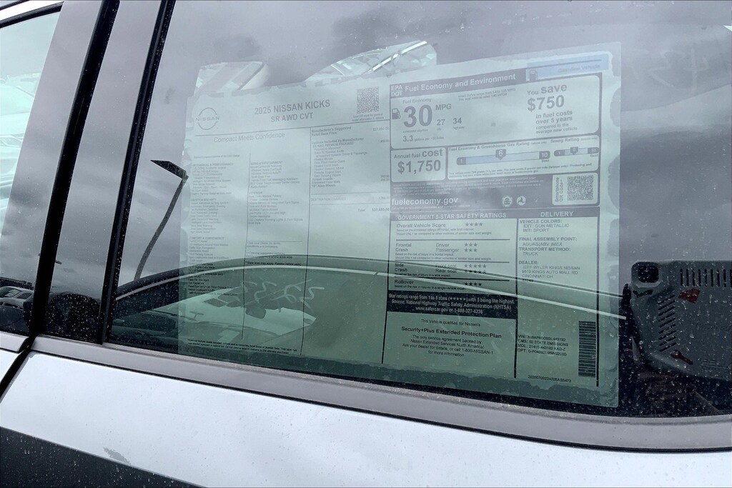 $4,074 off MSRP! Jeff Wyler Kings Nissan is very proud to offer this wonderful-looking 2025 Nissan Kicks SR in Gun Metallic. Well equipped with: SR Premium Package (Bose 10 -Speaker Audio, Driver Seat-Mounted Supplemental Air Bag, Heated Front Seats, Heated Steering Wheel, Panoramic Moonroof, Rain Sensing Wipers, and Remote Engine Start), 17" Alloy Wheels, 19" Alloy Wheels, 4-Wheel Disc Brakes, 6 Speakers, ABS brakes, Air Conditioning, Alloy wheels, AM/FM radio: Sirius, Auto High-beam Headlights, Automatic temperature control, Brake assist, Bumpers: body-color, Carpeted Floor Mats, Delay-off headlights, Driver door bin, Driver vanity mirror, Dual front impact airbags, Dual front side impact airbags, Electronic Stability Control, Four wheel independent suspension, Front anti-roll bar, Front Bucket Seats, Front Center Armrest, Front reading lights, Fully automatic headlights, Heated door mirrors, Illuminated entry, Knee airbag, Leather Shift Knob, Leather steering wheel, Low tire pressure warning, Occupant sensing airbag, Outside temperature display, Overhead airbag, Overhead console, Panic alarm, Passenger door bin, Passenger vanity mirror, Power door mirrors, Power steering, Power windows, Radio data system, Radio: AM/FM Audio System, Rear anti-roll bar, Rear reading lights, Rear seat center armrest, Rear side impact airbag, Rear window defroster, Rear window wiper, Remote keyless entry, Security system, Speed control, Speed-sensing steering, Splash Guards, Split folding rear seat, Spoiler, Sport Cloth/Leatherette Seat Trim, Sport steering wheel, Steering wheel mounted audio controls, Tachometer, Telescoping steering wheel, Tilt steering wheel, Traction control, Trip computer, Turn signal indicator mirrors, Variably intermittent wipers, and Wireless Apple CarPlay/Wireless Android Auto. 27/34 City/Highway MPGWyler Family First Package Includes: NanoCure Appearance Protection: Exterior & Interior Chemical Sealant Applied to Protect Against Environmental Hazards (7 Year Warranty Coverage). Pulse- Rear end Collision Avoidance System Theft Deterrent Strategy gives you 5 Years of Coverage against vehicle Theft, Offering up to a $5,000 benefit. Used vehicles 10 years of age or newer with less than 100,000 miles are eligible for the Wyler Assurance Program, but eligible vehicles must pass our reconditioning process and multi-point inspection. Provided the vehicle passes inspection, vehicles will be eligible for the 6 month/6,000 mile limited warranty. The 6 month/6,000 mile limited warranty is NOT available on AS-IS vehicles, wholesale vehicles, lease buyback/pass-thru vehicles or un-inspected vehicles. Note that this program can also apply to vehicles where the remaining factory coverage is less than 6 months or 6,000 miles. Please check the Federal Trade Commission (FTC) Buyers guide on the vehicle for full details as to whether or not warranty coverage may apply. Contact Dealer for additional details. The Wyler Assurance 6 month/6,000 Mile limited warranty ends 6 months from the date of the Retail Purchase Agreement (BUYERS ORDER) or when the vehicle's odometer registers 6,000 additional miles to the mileage listed on the BUYERS ORDER, whichever comes first. Your Deductible - The warranty holder on your contract pays the first $100 of each covered repair. Price includes: $1000 - Nissan MY25 New Kicks (SV and SR) Retail/Lease Bonus Cash. Exp. 01/05/2026 $500 - Nissan MWR MY25 New Kicks Bonus Cash - December. Exp. 01/05/2026