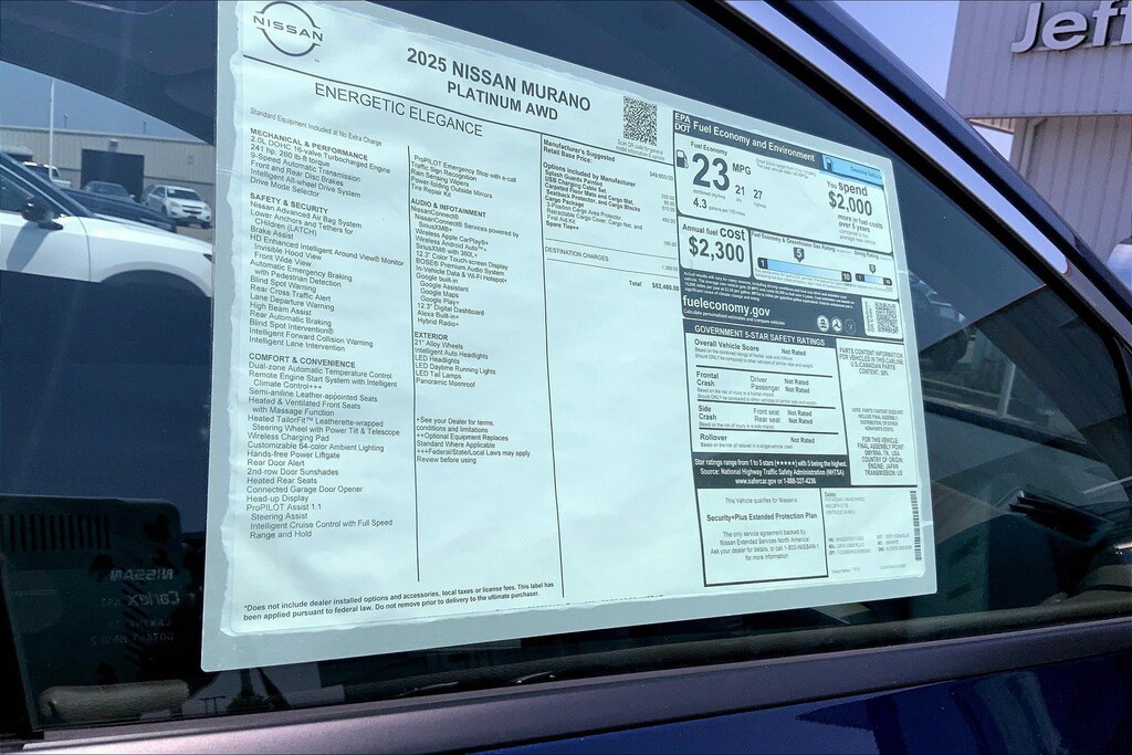 $11,158 off MSRP! Jeff Wyler Kings Nissan is proud to offer this beautiful 2025 Nissan Murano Platinum in Deep Ocean Blue Pearl. Well equipped with: Cargo Package (3-Position Cargo Area Protector, Cargo Net, First Aid Kit, and Retractable Cargo Cover), 9-Speed Automatic, AWD, 10 Speakers, 21" Alloy Wheels, 4-Wheel Disc Brakes, ABS brakes, Air Conditioning, Alloy wheels, AM/FM radio: SiriusXM w/360L, Auto High-beam Headlights, Auto tilt-away steering wheel, Auto-dimming Rear-View mirror, Automatic temperature control, Brake assist, Bumpers: body-color, Carpeted Floor & Cargo Mats, Child-Seat-Sensing Airbag, Compass, Delay-off headlights, Driver door bin, Driver vanity mirror, Dual front impact airbags, Dual front side impact airbags, Electronic Stability Control, Emergency communication system: NissanConnect Services, Four wheel independent suspension, Front anti-roll bar, Front Bucket Seats, Front Center Armrest, Front dual zone A/C, Front reading lights, Fully automatic headlights, Garage door transmitter: HomeLink, Heads-Up Display, Heated & Ventilated Front Bucket Seats w/Massage, Heated door mirrors, Heated front seats, Heated rear seats, Heated steering wheel, Illuminated entry, Knee airbag, Low tire pressure warning, Memory seat, Navigation system: NissanConnect with Navigation and Services, Occupant sensing airbag, Outside temperature display, Overhead airbag, Overhead console, Painted Splash Guards, Panic alarm, Passenger door bin, Passenger vanity mirror, Power door mirrors, Power driver seat, Power Liftgate, Power moonroof: Panoramic, Power passenger seat, Power steering, Power windows, Quilted Semi-Aniline Leather-Appointed Seat Trim, Radio data system, Radio: NissanConnect w/Hybrid Radio, Rain sensing wipers, Rear anti-roll bar, Rear reading lights, Rear seat center armrest, Rear side impact airbag, Rear window defroster, Rear window wiper, Remote keyless entry, Security system, Speed control, Speed-Sensitive Wipers, Split folding rear seat, Spoiler, Steering wheel memory, Steering wheel mounted audio controls, Tachometer, Telescoping steering wheel, Tilt steering wheel, Traction control, Trip computer, Turn signal indicator mirrors, USB Charging Cables, Variably intermittent wipers, Ventilated front seats, and Wireless Apple CarPlay/Wireless Android Auto. 21/27 City/Highway MPGWyler Family First Package Includes: NanoCure Appearance Protection: Exterior & Interior Chemical Sealant Applied to Protect Against Environmental Hazards (7 Year Warranty Coverage). Pulse- Rear end Collision Avoidance System Theft Deterrent Strategy gives you 5 Years of Coverage against vehicle Theft, Offering up to a $5,000 benefit. Used vehicles 10 years of age or newer with less than 100,000 miles are eligible for the Wyler Assurance Program, but eligible vehicles must pass our reconditioning process and multi-point inspection. Provided the vehicle passes inspection, vehicles will be eligible for the 6 month/6,000 mile limited warranty. The 6 month/6,000 mile limited warranty is NOT available on AS-IS vehicles, wholesale vehicles, lease buyback/pass-thru vehicles or un-inspected vehicles. Note that this program can also apply to vehicles where the remaining factory coverage is less than 6 months or 6,000 miles. Please check the Federal Trade Commission (FTC) Buyers guide on the vehicle for full details as to whether or not warranty coverage may apply. Contact Dealer for additional details. The Wyler Assurance 6 month/6,000 Mile limited warranty ends 6 months from the date of the Retail Purchase Agreement (BUYERS ORDER) or when the vehicle's odometer registers 6,000 additional miles to the mileage listed on the BUYERS ORDER, whichever comes first. Your Deductible - The warranty holder on your contract pays the first $100 of each covered repair. Price includes: $5000 - Nissan Customer Cash. Exp. 01/05/2026