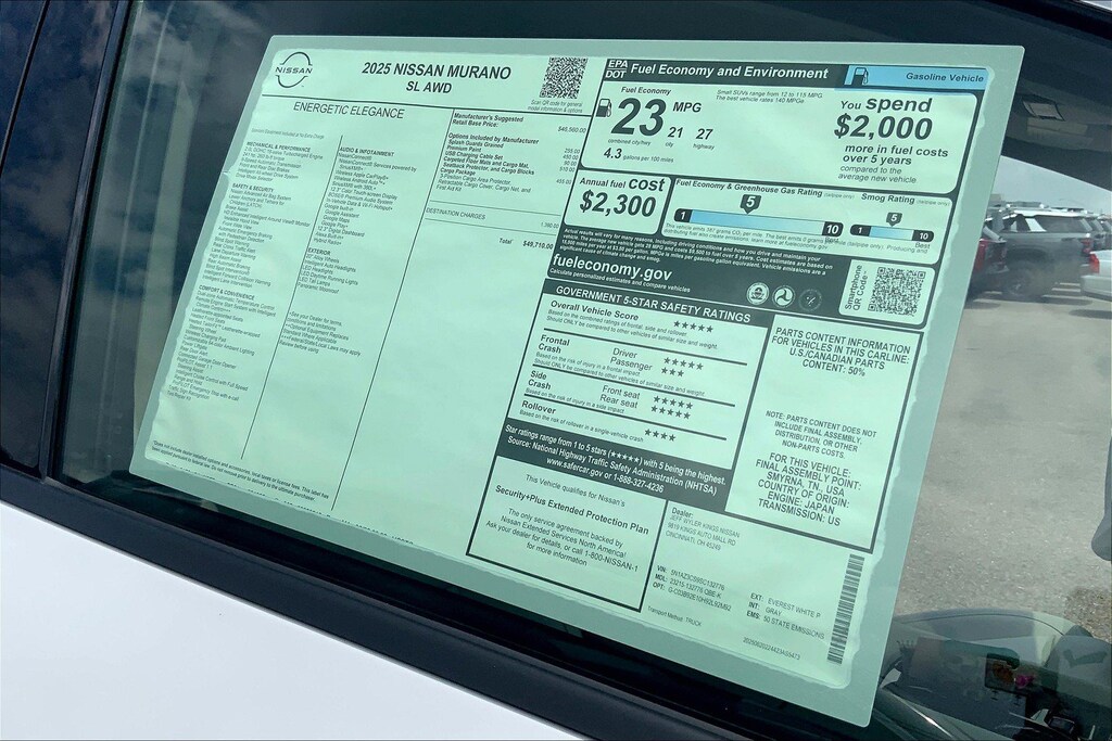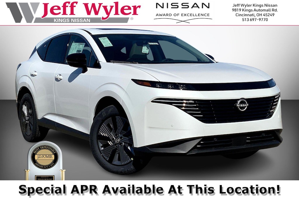 $10,822 off MSRP! Jeff Wyler Kings Nissan is excited to offer this great 2025 Nissan Murano SL in Everest White Pearl Tricoat. Well equipped with: Cargo Package (3-Position Cargo Area Protector, Cargo Net, First Aid Kit, and Retractable Cargo Cover), 9-Speed Automatic, AWD, 10 Speakers, 20" Alloy Wheels, 4-Wheel Disc Brakes, ABS brakes, Air Conditioning, Alloy wheels, AM/FM radio: SiriusXM w/360L, Auto High-beam Headlights, Auto-dimming Rear-View mirror, Automatic temperature control, Brake assist, Bumpers: body-color, Carpeted Floor & Cargo Mats, Child-Seat-Sensing Airbag, Compass, Delay-off headlights, Driver door bin, Driver vanity mirror, Dual front impact airbags, Dual front side impact airbags, Electronic Stability Control, Emergency communication system: NissanConnect Services, Four wheel independent suspension, Front anti-roll bar, Front Bucket Seats, Front Center Armrest, Front dual zone A/C, Front reading lights, Fully automatic headlights, Garage door transmitter: myQ Connected Garage, Grained Splash Guards, Heated door mirrors, Heated Front Bucket Seats, Heated front seats, Heated steering wheel, Illuminated entry, Knee airbag, Low tire pressure warning, Memory seat, Navigation system: NissanConnect with Navigation and Services, Occupant sensing airbag, Outside temperature display, Overhead airbag, Overhead console, Panic alarm, Passenger door bin, Passenger vanity mirror, Power door mirrors, Power driver seat, Power Liftgate, Power moonroof: Panoramic, Power passenger seat, Power steering, Power windows, Premium Paint, PVC (Leatherette) Seat Trim, Radio data system, Radio: NissanConnect w/Hybrid Radio, Rear anti-roll bar, Rear reading lights, Rear seat center armrest, Rear side impact airbag, Rear window defroster, Rear window wiper, Remote keyless entry, Security system, Speed control, Speed-Sensitive Wipers, Split folding rear seat, Spoiler, Steering wheel mounted audio controls, Tachometer, Telescoping steering wheel, Tilt steering wheel, Traction control, Trip computer, Turn signal indicator mirrors, USB Charging Cables, Variably intermittent wipers, and Wireless Apple CarPlay/Wireless Android Auto. 21/27 City/Highway MPGWyler Family First Package Includes: NanoCure Appearance Protection: Exterior & Interior Chemical Sealant Applied to Protect Against Environmental Hazards (7 Year Warranty Coverage). Pulse- Rear end Collision Avoidance System Theft Deterrent Strategy gives you 5 Years of Coverage against vehicle Theft, Offering up to a $5,000 benefit. Used vehicles 10 years of age or newer with less than 100,000 miles are eligible for the Wyler Assurance Program, but eligible vehicles must pass our reconditioning process and multi-point inspection. Provided the vehicle passes inspection, vehicles will be eligible for the 6 month/6,000 mile limited warranty. The 6 month/6,000 mile limited warranty is NOT available on AS-IS vehicles, wholesale vehicles, lease buyback/pass-thru vehicles or un-inspected vehicles. Note that this program can also apply to vehicles where the remaining factory coverage is less than 6 months or 6,000 miles. Please check the Federal Trade Commission (FTC) Buyers guide on the vehicle for full details as to whether or not warranty coverage may apply. Contact Dealer for additional details. The Wyler Assurance 6 month/6,000 Mile limited warranty ends 6 months from the date of the Retail Purchase Agreement (BUYERS ORDER) or when the vehicle's odometer registers 6,000 additional miles to the mileage listed on the BUYERS ORDER, whichever comes first. Your Deductible - The warranty holder on your contract pays the first $100 of each covered repair. Price includes: $5000 - Nissan Customer Cash. Exp. 01/05/2026