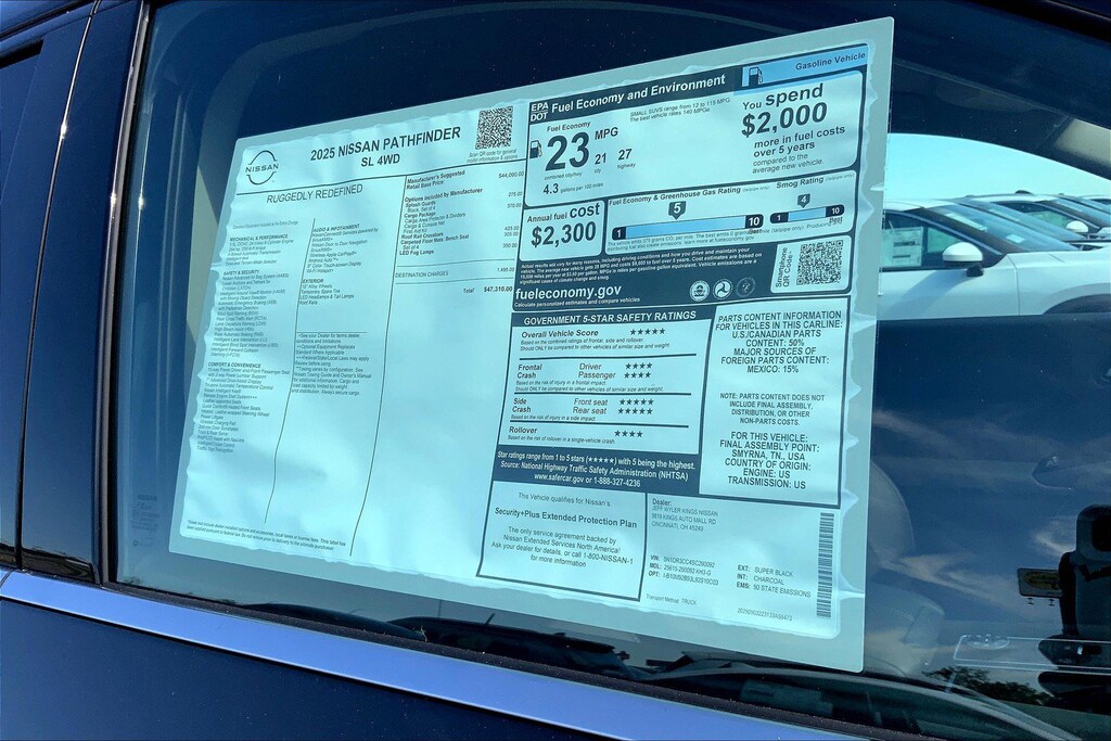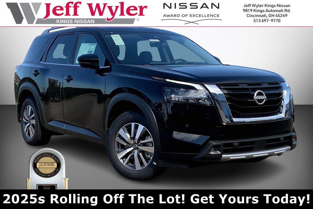 $10,881 off MSRP! Jeff Wyler Kings Nissan is pleased to offer this good-looking 2025 Nissan Pathfinder SL in Super Black. Well equipped with: Cargo Package (Cargo Area Protector, Cargo Net, and First Aid), 4WD, 3rd row seats: bench, 4-Wheel Disc Brakes, 6 Speakers, ABS brakes, Air Conditioning, Alloy wheels, AM/FM radio: SiriusXM, Auto High-beam Headlights, Auto-dimming Rear-View mirror, Automatic temperature control, Bench Seat Carpeted Floor Mats (set of 4), Brake assist, Bumpers: body-color, Cross Bars, Delay-off headlights, Driver door bin, Driver vanity mirror, Dual front impact airbags, Dual front side impact airbags, Electronic Stability Control, Emergency communication system, Exterior Parking Camera Rear, Four wheel independent suspension, Front anti-roll bar, Front Bucket Seats, Front Center Armrest, Front dual zone A/C, Front reading lights, Fully automatic headlights, Garage door transmitter: HomeLink, Heated door mirrors, Heated Front Bucket Seats, Heated front seats, Heated steering wheel, Illuminated entry, Knee airbag, Leather steering wheel, Leather-Appointed Seating Surfaces, LED Fog Lamps, Low tire pressure warning, Navigation system: NissanConnect with Navigation and Services, NissanConnect featuring Apple CarPlay and Android Auto, NissanConnect with Navigation and Services, Occupant sensing airbag, Outside temperature display, Overhead airbag, Overhead console, Panic alarm, Passenger door bin, Passenger vanity mirror, Power door mirrors, Power driver seat, Power Liftgate, Power passenger seat, Power steering, Power windows, Radio data system, Radio: AM/FM Audio System, Rear air conditioning, Rear anti-roll bar, Rear reading lights, Rear seat center armrest, Rear side impact airbag, Rear window defroster, Rear window wiper, Reclining 3rd row seat, Remote keyless entry, Security system, Speed control, Speed-sensing steering, Split folding rear seat, Spoiler, Steering wheel mounted audio controls, Tachometer, Telescoping steering wheel, Tilt steering wheel, Traction control, Trip computer, Turn signal indicator mirrors, Variably intermittent wipers, and Wheels: 18" x 8J Machined Alloy. 21/27 City/Highway MPGWyler Family First Package Includes: NanoCure Appearance Protection: Exterior & Interior Chemical Sealant Applied to Protect Against Environmental Hazards (7 Year Warranty Coverage). Pulse- Rear end Collision Avoidance System Theft Deterrent Strategy gives you 5 Years of Coverage against vehicle Theft, Offering up to a $5,000 benefit. Used vehicles 10 years of age or newer with less than 100,000 miles are eligible for the Wyler Assurance Program, but eligible vehicles must pass our reconditioning process and multi-point inspection. Provided the vehicle passes inspection, vehicles will be eligible for the 6 month/6,000 mile limited warranty. The 6 month/6,000 mile limited warranty is NOT available on AS-IS vehicles, wholesale vehicles, lease buyback/pass-thru vehicles or un-inspected vehicles. Note that this program can also apply to vehicles where the remaining factory coverage is less than 6 months or 6,000 miles. Please check the Federal Trade Commission (FTC) Buyers guide on the vehicle for full details as to whether or not warranty coverage may apply. Contact Dealer for additional details. The Wyler Assurance 6 month/6,000 Mile limited warranty ends 6 months from the date of the Retail Purchase Agreement (BUYERS ORDER) or when the vehicle's odometer registers 6,000 additional miles to the mileage listed on the BUYERS ORDER, whichever comes first. Your Deductible - The warranty holder on your contract pays the first $100 of each covered repair. Price includes: $5000 - Nissan Customer Cash. Exp. 02/02/2026