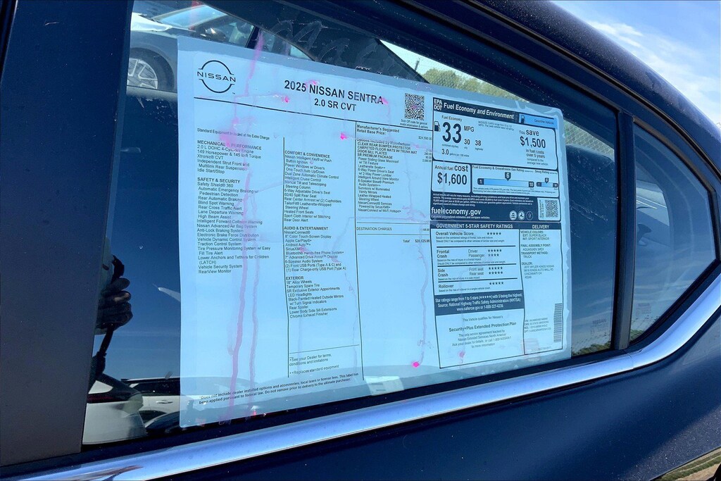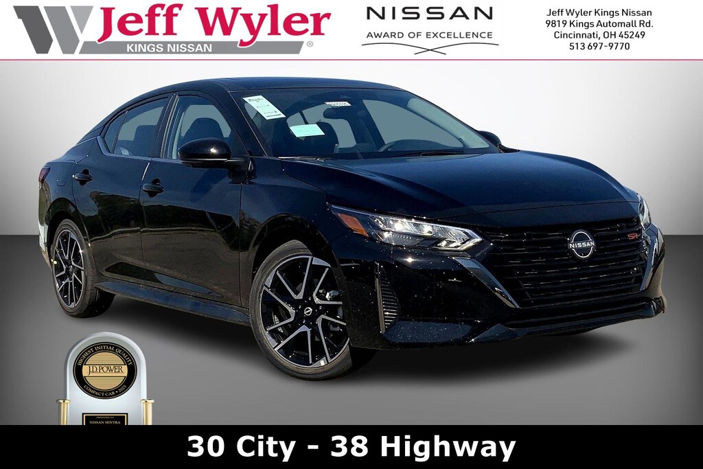 $5,362 off MSRP! Jeff Wyler Kings Nissan is very proud to offer this charming-looking 2025 Nissan Sentra SR in Super Black. Well equipped with: SR Premium Package (6-Way Power Driver's Seat, Bose Premium Audio System with 8 Speakers, Intelligent Around View Monitor (I-AVM), Leather Heated Steering Wheel, Leatherette Seat Trim, NissanConnect Services, Power Sliding Glass Moonroof with Tilt Feature, Sunvisors with Illuminated Vanity Mirrors, and Wi-Fi Hotspot), CVT with Xtronic, Sport Cloth, 18" Alloy Wheels, 4-Wheel Disc Brakes, 8 Speakers, ABS brakes, Air Conditioning, Alloy wheels, AM/FM radio: SiriusXM, Auto High-beam Headlights, Automatic temperature control, Blind Spot Warning, Brake assist, Bumpers: body-color, Carpeted Floor Mats with Trunk Mat, Clear Rear Bumper Protector, Delay-off headlights, Door Sill Plates, Driver door bin, Driver vanity mirror, Dual front impact airbags, Dual front side impact airbags, Electronic Stability Control, Four wheel independent suspension, Front anti-roll bar, Front Bucket Seats, Front Center Armrest, Front dual zone A/C, Front reading lights, Fully automatic headlights, Heated door mirrors, Heated Front Bucket Seats, Heated front seats, Illuminated entry, Knee airbag, Leather Shift Knob, Low tire pressure warning, NissanConnect featuring Apple CarPlay and Android Auto, Occupant sensing airbag, Outside temperature display, Overhead airbag, Overhead console, Panic alarm, Passenger door bin, Passenger vanity mirror, Power door mirrors, Power steering, Power windows, Radio data system, Radio: AM/FM with RDS/MP3/Aux-in, Rear anti-roll bar, Rear Parking Sensors, Rear seat center armrest, Rear side impact airbag, Rear window defroster, Remote keyless entry, Security system, Speed control, Speed-sensing steering, Split folding rear seat, Spoiler, Sport Cloth Seat Trim, Steering wheel mounted audio controls, Tachometer, Telescoping steering wheel, Tilt steering wheel, Traction control, Trip computer, Turn signal indicator mirrors, and Variably intermittent wipers. 30/38 City/Highway MPGWyler Family First Package Includes: NanoCure Appearance Protection: Exterior & Interior Chemical Sealant Applied to Protect Against Environmental Hazards (7 Year Warranty Coverage). Pulse- Rear end Collision Avoidance System Theft Deterrent Strategy gives you 5 Years of Coverage against vehicle Theft, Offering up to a $5,000 benefit. Used vehicles 10 years of age or newer with less than 100,000 miles are eligible for the Wyler Assurance Program, but eligible vehicles must pass our reconditioning process and multi-point inspection. Provided the vehicle passes inspection, vehicles will be eligible for the 6 month/6,000 mile limited warranty. The 6 month/6,000 mile limited warranty is NOT available on AS-IS vehicles, wholesale vehicles, lease buyback/pass-thru vehicles or un-inspected vehicles. Note that this program can also apply to vehicles where the remaining factory coverage is less than 6 months or 6,000 miles. Please check the Federal Trade Commission (FTC) Buyers guide on the vehicle for full details as to whether or not warranty coverage may apply. Contact Dealer for additional details. The Wyler Assurance 6 month/6,000 Mile limited warranty ends 6 months from the date of the Retail Purchase Agreement (BUYERS ORDER) or when the vehicle's odometer registers 6,000 additional miles to the mileage listed on the BUYERS ORDER, whichever comes first. Your Deductible - The warranty holder on your contract pays the first $100 of each covered repair. Price includes: $1250 - Nissan MY25 Sentra Bonus Cash. Exp. 02/02/2026