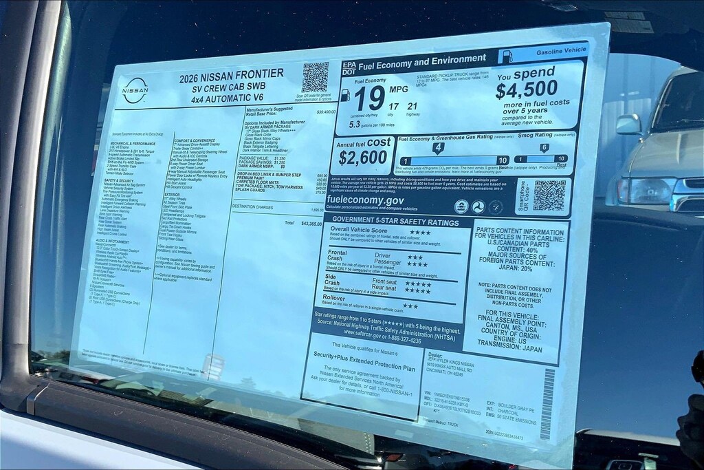 $4,715 off MSRP! Jeff Wyler Kings Nissan is pleased to offer this charming-looking 2026 Nissan Frontier SV in Boulder Gray Pearl. Well equipped with: Dark Armor Package (Dark FRONTIER Tailgate Lettering, Dark Grill Surround/Mesh/Inner Fascia, Dark Mirror Caps, and Wheels: 17" Dark), Tow Package, 4WD, 17" Alloy Wheels, 3.692 Axle Ratio, 4-Wheel Disc Brakes, 6 Speakers, ABS brakes, Air Conditioning, Alloy wheels, AM/FM radio: SiriusXM, Anti-whiplash front head restraints, Auto High-beam Headlights, Black Tailgate Logo Insert, Blind Spot Warning, Brake assist, Bumpers: body-color, Carpeted Floor Mats, Delay-off headlights, Driver door bin, Driver vanity mirror, Drop-In Bed Liner & Bumper Step, Dual front impact airbags, Dual front side impact airbags, Electronic Stability Control, Emergency communication system, Front anti-roll bar, Front Bucket Seats, Front Center Armrest, Front reading lights, Front wheel independent suspension, Fully automatic headlights, Illuminated entry, Knee airbag, Low tire pressure warning, Occupant sensing airbag, Overhead airbag, Overhead console, Panic alarm, Passenger door bin, Passenger vanity mirror, Power door mirrors, Power driver seat, Power steering, Power windows, Premium Cloth Seat Trim, Premium Paint, Radio data system, Radio: SXM/AM/FM/AUX/USB Audio System, Rear anti-roll bar, Rear seat center armrest, Rear side impact airbag, Rear step bumper, Remote keyless entry, Security system, Speed control, Speed-sensing steering, Splash Guards, Split folding rear seat, Steering wheel mounted audio controls, Tachometer, Telescoping steering wheel, Tilt steering wheel, Tow/Haul Mode Switch, Traction control, Trip computer, Variably intermittent wipers, Voltmeter, and Wireless Apple CarPlay/Wireless Android Auto.Wyler Family First Package Includes: NanoCure Appearance Protection: Exterior & Interior Chemical Sealant Applied to Protect Against Environmental Hazards (7 Year Warranty Coverage). Pulse- Rear end Collision Avoidance System Theft Deterrent Strategy gives you 5 Years of Coverage against vehicle Theft, Offering up to a $5,000 benefit. Used vehicles 10 years of age or newer with less than 100,000 miles are eligible for the Wyler Assurance Program, but eligible vehicles must pass our reconditioning process and multi-point inspection. Provided the vehicle passes inspection, vehicles will be eligible for the 6 month/6,000 mile limited warranty. The 6 month/6,000 mile limited warranty is NOT available on AS-IS vehicles, wholesale vehicles, lease buyback/pass-thru vehicles or un-inspected vehicles. Note that this program can also apply to vehicles where the remaining factory coverage is less than 6 months or 6,000 miles. Please check the Federal Trade Commission (FTC) Buyers guide on the vehicle for full details as to whether or not warranty coverage may apply. Contact Dealer for additional details. The Wyler Assurance 6 month/6,000 Mile limited warranty ends 6 months from the date of the Retail Purchase Agreement (BUYERS ORDER) or when the vehicle's odometer registers 6,000 additional miles to the mileage listed on the BUYERS ORDER, whichever comes first. Your Deductible - The warranty holder on your contract pays the first $100 of each covered repair. Price includes: $2500 - Nissan Customer Cash. Exp. 01/05/2026