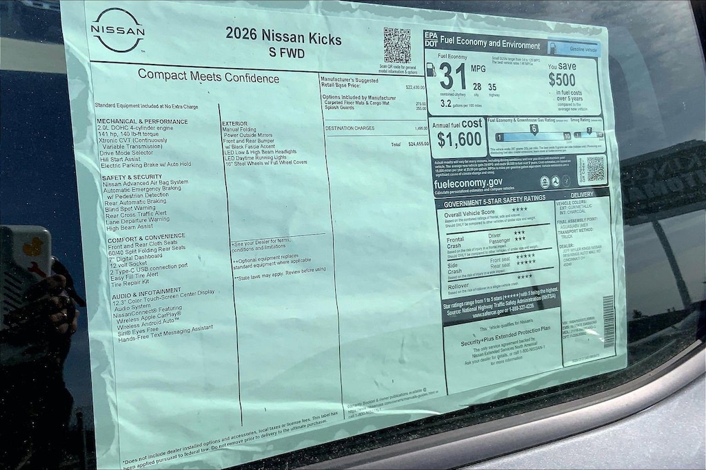 $993 off MSRP! Jeff Wyler Kings Nissan is excited to offer this stunning-looking 2026 Nissan Kicks S in Gun Metallic. Well equipped with: 16" Steel Wheels w/Full Covers, 4 Speakers, 4-Wheel Disc Brakes, ABS brakes, Air Conditioning, AM/FM radio, Auto High-beam Headlights, Blind Spot Warning, Brake assist, Bumpers: body-color, Carpeted Floor Mats & Cargo Mat, Cloth Seat Trim, Driver door bin, Driver vanity mirror, Driver's Seat Mounted Armrest, Dual front impact airbags, Dual front side impact airbags, Electronic Stability Control, Emergency communication system, Exterior Parking Camera Rear, Front anti-roll bar, Front Bucket Seats, Front reading lights, Front wheel independent suspension, Fully automatic headlights, Illuminated entry, Knee airbag, Low tire pressure warning, NissanConnect featuring Apple CarPlay and Android Auto, Occupant sensing airbag, Outside temperature display, Overhead airbag, Panic alarm, Passenger door bin, Passenger vanity mirror, Power door mirrors, Power steering, Power windows, Radio data system, Radio: AM/FM/SiriusXM Audio System, Rear anti-roll bar, Rear reading lights, Rear side impact airbag, Rear window defroster, Rear window wiper, Remote keyless entry, Security system, Speed control, Speed-sensing steering, Splash Guards, Split folding rear seat, Spoiler, Sport steering wheel, Steering wheel mounted audio controls, Tachometer, Telescoping steering wheel, Tilt steering wheel, Traction control, Trip computer, and Variably intermittent wipers. 28/35 City/Highway MPGWyler Family First Package Includes: NanoCure Appearance Protection: Exterior & Interior Chemical Sealant Applied to Protect Against Environmental Hazards (7 Year Warranty Coverage). Pulse- Rear end Collision Avoidance System Theft Deterrent Strategy gives you 5 Years of Coverage against vehicle Theft, Offering up to a $5,000 benefit. Used vehicles 10 years of age or newer with less than 100,000 miles are eligible for the Wyler Assurance Program, but eligible vehicles must pass our reconditioning process and multi-point inspection. Provided the vehicle passes inspection, vehicles will be eligible for the 6 month/6,000 mile limited warranty. The 6 month/6,000 mile limited warranty is NOT available on AS-IS vehicles, wholesale vehicles, lease buyback/pass-thru vehicles or un-inspected vehicles. Note that this program can also apply to vehicles where the remaining factory coverage is less than 6 months or 6,000 miles. Please check the Federal Trade Commission (FTC) Buyers guide on the vehicle for full details as to whether or not warranty coverage may apply. Contact Dealer for additional details. The Wyler Assurance 6 month/6,000 Mile limited warranty ends 6 months from the date of the Retail Purchase Agreement (BUYERS ORDER) or when the vehicle's odometer registers 6,000 additional miles to the mileage listed on the BUYERS ORDER, whichever comes first. Your Deductible - The warranty holder on your contract pays the first $100 of each covered repair.