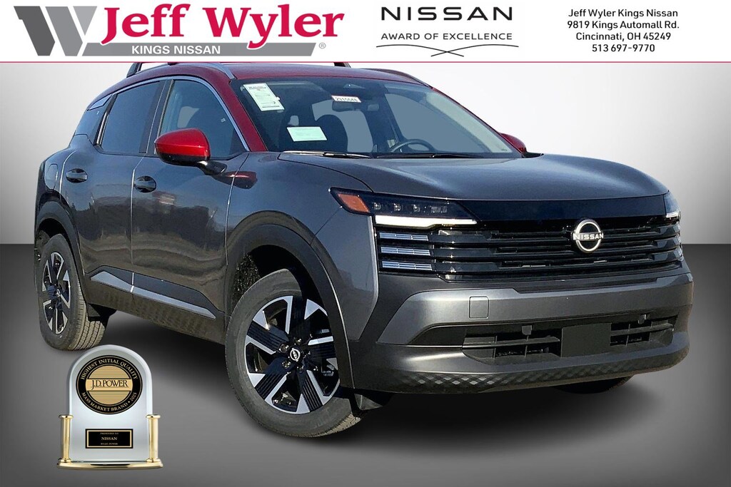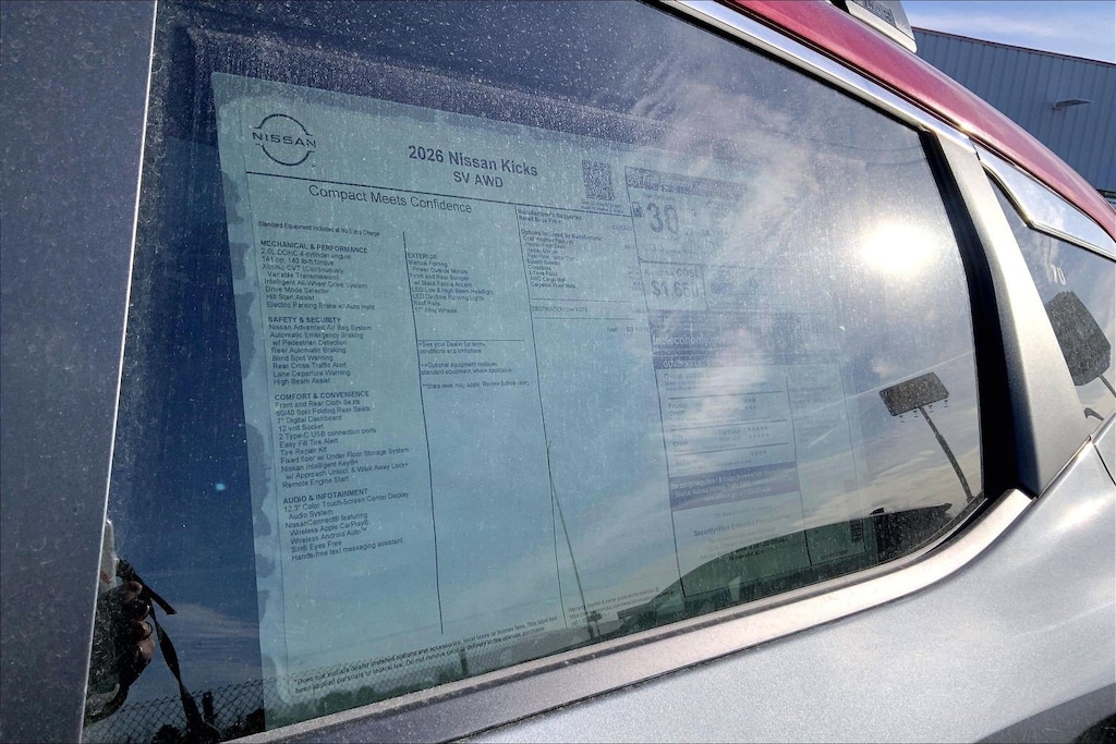 $2,171 off MSRP! Jeff Wyler Kings Nissan is honored to offer this gorgeous-looking 2026 Nissan Kicks SV in Gun Metallic/Scarlet Ember Tintcoat. Well equipped with: Cold Weather Package (Heated Front Seats, Heated Mirrors, and Rear Floor Heater Ducts), 17" Alloy Wheels, 2-Tone Paint, 4 Speakers, 4-Wheel Disc Brakes, ABS brakes, Air Conditioning, Alloy wheels, AM/FM radio, Auto High-beam Headlights, Automatic temperature control, AWD Cargo Mat, Blind Spot Warning, Brake assist, Bumpers: body-color, Carpeted Floor Mats, Cloth Seat Trim, Crossbars, Driver door bin, Driver vanity mirror, Dual front impact airbags, Dual front side impact airbags, Electronic Stability Control, Emergency communication system, Exterior Parking Camera Rear, Four wheel independent suspension, Front anti-roll bar, Front Bucket Seats, Front Center Armrest, Front reading lights, Fully automatic headlights, Illuminated entry, Knee airbag, Low tire pressure warning, NissanConnect featuring Apple CarPlay and Android Auto, Occupant sensing airbag, Outside temperature display, Overhead airbag, Panic alarm, Passenger door bin, Passenger vanity mirror, Power door mirrors, Power steering, Power windows, Radio data system, Radio: AM/FM/SiriusXM Audio System, Rear anti-roll bar, Rear reading lights, Rear side impact airbag, Rear window defroster, Rear window wiper, Remote keyless entry, Security system, Speed control, Speed-sensing steering, Splash Guards, Split folding rear seat, Spoiler, Sport steering wheel, Steering wheel mounted audio controls, Tachometer, Telescoping steering wheel, Tilt steering wheel, Traction control, Trip computer, and Variably intermittent wipers. 27/34 City/Highway MPGWyler Family First Package Includes: NanoCure Appearance Protection: Exterior & Interior Chemical Sealant Applied to Protect Against Environmental Hazards (7 Year Warranty Coverage). Pulse- Rear end Collision Avoidance System Theft Deterrent Strategy gives you 5 Years of Coverage against vehicle Theft, Offering up to a $5,000 benefit. Used vehicles 10 years of age or newer with less than 100,000 miles are eligible for the Wyler Assurance Program, but eligible vehicles must pass our reconditioning process and multi-point inspection. Provided the vehicle passes inspection, vehicles will be eligible for the 6 month/6,000 mile limited warranty. The 6 month/6,000 mile limited warranty is NOT available on AS-IS vehicles, wholesale vehicles, lease buyback/pass-thru vehicles or un-inspected vehicles. Note that this program can also apply to vehicles where the remaining factory coverage is less than 6 months or 6,000 miles. Please check the Federal Trade Commission (FTC) Buyers guide on the vehicle for full details as to whether or not warranty coverage may apply. Contact Dealer for additional details. The Wyler Assurance 6 month/6,000 Mile limited warranty ends 6 months from the date of the Retail Purchase Agreement (BUYERS ORDER) or when the vehicle's odometer registers 6,000 additional miles to the mileage listed on the BUYERS ORDER, whichever comes first. Your Deductible - The warranty holder on your contract pays the first $100 of each covered repair. Price includes: $1000 - Nissan Customer Cash. Exp. 03/31/2026
