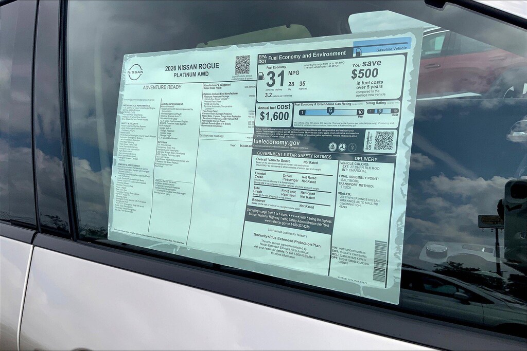 $6,453 off MSRP! Jeff Wyler Kings Nissan is pumped up to offer this attractive 2026 Nissan Rogue Platinum in Champagne Silver Metallic. Well equipped with: Platinum Premium Package (Head-Up Display, Heated Rear Seats, Motion-Activated Power Liftgate, and Tri-Zone Automatic Temperature Control), AWD, 10 Speakers, 4-Wheel Disc Brakes, ABS brakes, Air Conditioning, Alloy wheels, AM/FM radio: SiriusXM w/360L, Auto High-beam Headlights, Auto-dimming Rear-View mirror, Automatic temperature control, Black Splash Guards (set of 4), Bose Premium Audio System, Brake assist, Bumpers: body-color, Chrome Rear Bumper Protector, Delay-off headlights, Driver door bin, Driver vanity mirror, Dual front impact airbags, Dual front side impact airbags, Electronic Stability Control, Emergency communication system: NissanConnect Services, First Aid Kit, Floor Mats with 2-Piece Cargo Area Protector, Four wheel independent suspension, Front anti-roll bar, Front Bucket Seats, Front Center Armrest, Front dual zone A/C, Front reading lights, Fully automatic headlights, Garage door transmitter: myQ Connected Garage, Heads-Up Display, Heated door mirrors, Heated Front Bucket Seats, Heated front seats, Heated steering wheel, Illuminated entry, Illuminated Kick Plates, Knee airbag, Low tire pressure warning, Memory seat, Navigation system: Google Maps, Occupant sensing airbag, Outside temperature display, Overhead airbag, Overhead console, Panic alarm, Passenger door bin, Passenger vanity mirror, Power door mirrors, Power driver seat, Power Liftgate, Power moonroof, Power passenger seat, Power steering, Power windows, Quilted Semi-Aniline Leather-Appointed Seat Trim, Radio data system, Radio: AM/FM NissanConnect with Navigation, Rear anti-roll bar, Rear reading lights, Rear seat center armrest, Rear side impact airbag, Rear window defroster, Rear window wiper, Remote keyless entry, Retractable Cargo Cover, Security system, Speed control, Speed-sensing steering, Speed-Sensitive Wipers, Split folding rear seat, Spoiler, Steering wheel mounted audio controls, Tachometer, Telescoping steering wheel, Tilt steering wheel, Traction control, Trip computer, Turn signal indicator mirrors, Variably intermittent wipers, Wheels: 19" Unique Dark Painted Aluminum Alloy, and Wireless Apple CarPlay/Wireless Android Auto. 28/35 City/Highway MPGWyler Family First Package Includes: NanoCure Appearance Protection: Exterior & Interior Chemical Sealant Applied to Protect Against Environmental Hazards (7 Year Warranty Coverage). Pulse- Rear end Collision Avoidance System Theft Deterrent Strategy gives you 5 Years of Coverage against vehicle Theft, Offering up to a $5,000 benefit. Used vehicles 10 years of age or newer with less than 100,000 miles are eligible for the Wyler Assurance Program, but eligible vehicles must pass our reconditioning process and multi-point inspection. Provided the vehicle passes inspection, vehicles will be eligible for the 6 month/6,000 mile limited warranty. The 6 month/6,000 mile limited warranty is NOT available on AS-IS vehicles, wholesale vehicles, lease buyback/pass-thru vehicles or un-inspected vehicles. Note that this program can also apply to vehicles where the remaining factory coverage is less than 6 months or 6,000 miles. Please check the Federal Trade Commission (FTC) Buyers guide on the vehicle for full details as to whether or not warranty coverage may apply. Contact Dealer for additional details. The Wyler Assurance 6 month/6,000 Mile limited warranty ends 6 months from the date of the Retail Purchase Agreement (BUYERS ORDER) or when the vehicle's odometer registers 6,000 additional miles to the mileage listed on the BUYERS ORDER, whichever comes first. Your Deductible - The warranty holder on your contract pays the first $100 of each covered repair. Price includes: $3500 - Nissan Customer Cash. Exp. 02/02/2026