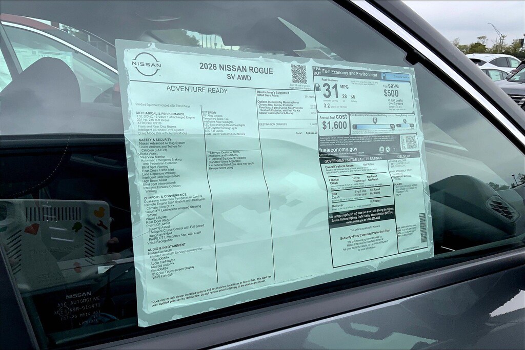 $5,441 off MSRP! Jeff Wyler Kings Nissan is pleased to offer this stunning 2026 Nissan Rogue SV in Gun Metallic. Well equipped with: AWD, 4-Wheel Disc Brakes, 6 Speakers, ABS brakes, Air Conditioning, Alloy wheels, AM/FM radio: Sirius, Apple CarPlay/Android Auto, Auto High-beam Headlights, Automatic temperature control, Black Splash Guards (set of 4), Brake assist, Bumpers: body-color, Chrome Rear Bumper Protector, Cloth Seat Trim with Patterned Inserts, Delay-off headlights, Driver door bin, Driver vanity mirror, Dual front impact airbags, Dual front side impact airbags, Electronic Stability Control, Emergency communication system: NissanConnect Services, Floor Mats with 1-Piece Cargo Area Protector, Four wheel independent suspension, Front anti-roll bar, Front Bucket Seats, Front Center Armrest, Front dual zone A/C, Front reading lights, Fully automatic headlights, Heated door mirrors, Illuminated entry, Knee airbag, Low tire pressure warning, Occupant sensing airbag, Outside temperature display, Overhead airbag, Overhead console, Panic alarm, Passenger door bin, Passenger vanity mirror, Power door mirrors, Power driver seat, Power Liftgate, Power steering, Power windows, Radio data system, Radio: AM/FM NissanConnect, Rear anti-roll bar, Rear seat center armrest, Rear side impact airbag, Rear window defroster, Rear window wiper, Remote keyless entry, Speed control, Speed-sensing steering, Speed-Sensitive Wipers, Split folding rear seat, Spoiler, Steering wheel mounted audio controls, Tachometer, Telescoping steering wheel, Tilt steering wheel, Traction control, Trip computer, Variably intermittent wipers, and Wheels: 18" Dark Painted Machine Finished Alloy. 28/35 City/Highway MPGWyler Family First Package Includes: NanoCure Appearance Protection: Exterior & Interior Chemical Sealant Applied to Protect Against Environmental Hazards (7 Year Warranty Coverage). Pulse- Rear end Collision Avoidance System Theft Deterrent Strategy gives you 5 Years of Coverage against vehicle Theft, Offering up to a $5,000 benefit. Used vehicles 10 years of age or newer with less than 100,000 miles are eligible for the Wyler Assurance Program, but eligible vehicles must pass our reconditioning process and multi-point inspection. Provided the vehicle passes inspection, vehicles will be eligible for the 6 month/6,000 mile limited warranty. The 6 month/6,000 mile limited warranty is NOT available on AS-IS vehicles, wholesale vehicles, lease buyback/pass-thru vehicles or un-inspected vehicles. Note that this program can also apply to vehicles where the remaining factory coverage is less than 6 months or 6,000 miles. Please check the Federal Trade Commission (FTC) Buyers guide on the vehicle for full details as to whether or not warranty coverage may apply. Contact Dealer for additional details. The Wyler Assurance 6 month/6,000 Mile limited warranty ends 6 months from the date of the Retail Purchase Agreement (BUYERS ORDER) or when the vehicle's odometer registers 6,000 additional miles to the mileage listed on the BUYERS ORDER, whichever comes first. Your Deductible - The warranty holder on your contract pays the first $100 of each covered repair. Price includes: $2500 - Nissan Customer Cash. Exp. 01/05/2026 $500 - Nissan MY26 Rogue and Murano Customer Cash. Exp. 01/05/2026