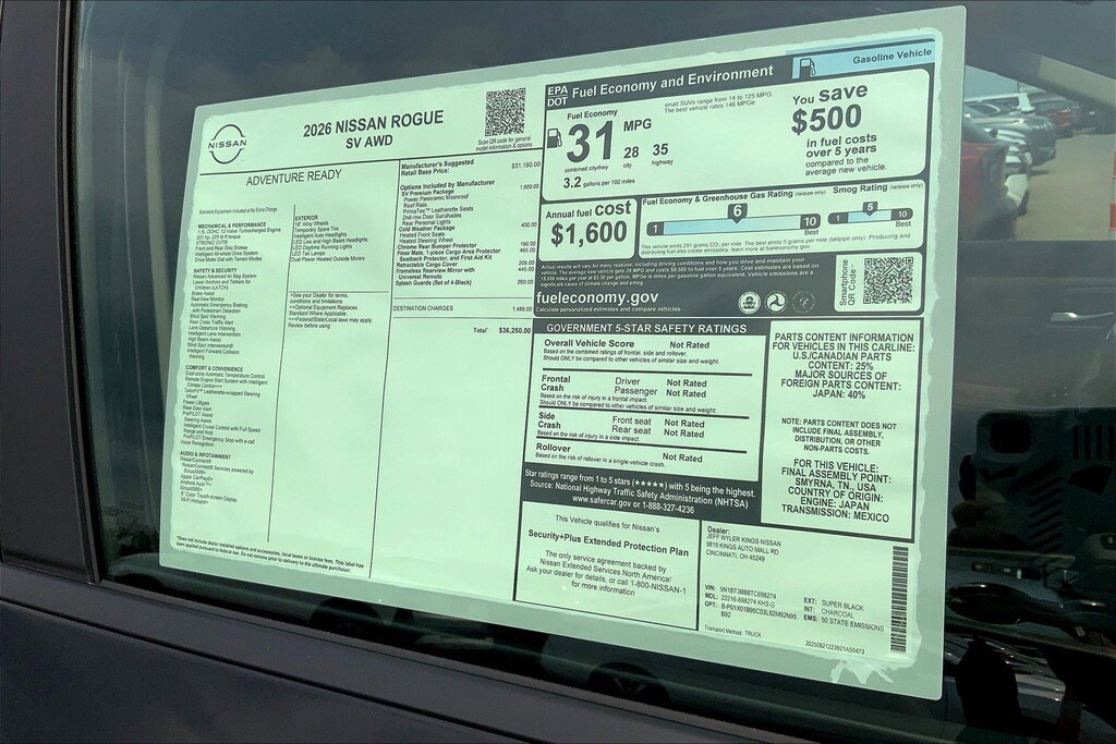 $6,710 off MSRP! Jeff Wyler Kings Nissan is very proud to offer this good-looking 2026 Nissan Rogue SV in Super Black. Well equipped with: Cold Weather Package (Heated Front Seats), SV Premium Package (Leatherette Door Trim Inserts with Stitch, Panoramic Moonroof, Prima-Tex Leatherette Seat Trim, Rear Door Sunshades, Rear Personal Lights, and Silver Painted Roof Rails), AWD, 4-Wheel Disc Brakes, 6 Speakers, ABS brakes, Air Conditioning, Alloy wheels, AM/FM radio: Sirius, Apple CarPlay/Android Auto, Auto High-beam Headlights, Automatic temperature control, Black Splash Guards (set of 4), Brake assist, Bumpers: body-color, Chrome Rear Bumper Protector, Cloth Seat Trim with Patterned Inserts, Delay-off headlights, Driver door bin, Driver vanity mirror, Dual front impact airbags, Dual front side impact airbags, Electronic Stability Control, Emergency communication system: NissanConnect Services, Floor Mats with 1-Piece Cargo Area Protector, Four wheel independent suspension, Frameless Rearview Mirror with Universal Remote, Front anti-roll bar, Front Bucket Seats, Front Center Armrest, Front dual zone A/C, Front reading lights, Fully automatic headlights, Heated door mirrors, Illuminated entry, Knee airbag, Low tire pressure warning, Occupant sensing airbag, Outside temperature display, Overhead airbag, Overhead console, Panic alarm, Passenger door bin, Passenger vanity mirror, Power door mirrors, Power driver seat, Power Liftgate, Power steering, Power windows, Radio data system, Radio: AM/FM NissanConnect, Rear anti-roll bar, Rear seat center armrest, Rear side impact airbag, Rear window defroster, Rear window wiper, Remote keyless entry, Retractable Cargo Cover, Speed control, Speed-sensing steering, Speed-Sensitive Wipers, Split folding rear seat, Spoiler, Steering wheel mounted audio controls, Tachometer, Telescoping steering wheel, Tilt steering wheel, Traction control, Trip computer, Variably intermittent wipers, and Wheels: 18" Dark Painted Machine Finished Alloy. 28/35 City/Highway MPGWyler Family First Package Includes: NanoCure Appearance Protection: Exterior & Interior Chemical Sealant Applied to Protect Against Environmental Hazards (7 Year Warranty Coverage). Pulse- Rear end Collision Avoidance System Theft Deterrent Strategy gives you 5 Years of Coverage against vehicle Theft, Offering up to a $5,000 benefit. Used vehicles 10 years of age or newer with less than 100,000 miles are eligible for the Wyler Assurance Program, but eligible vehicles must pass our reconditioning process and multi-point inspection. Provided the vehicle passes inspection, vehicles will be eligible for the 6 month/6,000 mile limited warranty. The 6 month/6,000 mile limited warranty is NOT available on AS-IS vehicles, wholesale vehicles, lease buyback/pass-thru vehicles or un-inspected vehicles. Note that this program can also apply to vehicles where the remaining factory coverage is less than 6 months or 6,000 miles. Please check the Federal Trade Commission (FTC) Buyers guide on the vehicle for full details as to whether or not warranty coverage may apply. Contact Dealer for additional details. The Wyler Assurance 6 month/6,000 Mile limited warranty ends 6 months from the date of the Retail Purchase Agreement (BUYERS ORDER) or when the vehicle's odometer registers 6,000 additional miles to the mileage listed on the BUYERS ORDER, whichever comes first. Your Deductible - The warranty holder on your contract pays the first $100 of each covered repair. Price includes: $3500 - Nissan Customer Cash. Exp. 02/02/2026