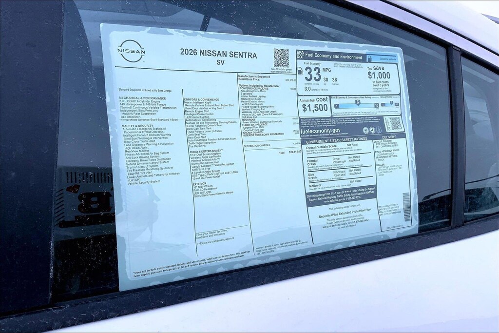 $2,008 off MSRP! Jeff Wyler Kings Nissan is pumped up to offer this gorgeous-looking 2026 Nissan Sentra SV in Fresh Powder. Well equipped with: Floor Mat Package, SV Convenience Package (6 Speakers, Ambient Lighting, Auto Diming Inside Mirror, Heated Exterior Mirrors, Heated Front Seats, Heated Steering Wheel, I-Key with Approach Unlock All Plus Walk Away Lock, Soft Knee Pad, Synthetic Leather Steering Wheel, Visor DR/AS w/LED Light, and Wireless Charging For Personal Devices), SV Moonroof Package (Power Tilt Sliding Sunroof with Manual Sunshade), CVT with Xtronic, Charcoal Cloth, 16" Machined Alloy Wheels, 4 Speakers, 4-Wheel Disc Brakes, ABS brakes, Air Conditioning, Alloy wheels, AM/FM radio: Sirius, Auto High-beam Headlights, Automatic temperature control, Body Colored Splash Guards (4-Piece), Brake assist, Bumpers: body-color, Delay-off headlights, Driver door bin, Driver vanity mirror, Dual front impact airbags, Dual front side impact airbags, Electronic Stability Control, Four wheel independent suspension, Front anti-roll bar, Front Bucket Seats, Front Center Armrest, Front reading lights, Fully automatic headlights, Illuminated entry, Interior Door Scuff Protection, Knee airbag, Low tire pressure warning, Occupant sensing airbag, Outside temperature display, Overhead airbag, Overhead console, Panic alarm, Passenger door bin, Passenger vanity mirror, Power door mirrors, Power steering, Power windows, Premium Cloth Seat Trim, Radio data system, Radio: AM/FM with RDS/MP3, Rear anti-roll bar, Rear side impact airbag, Rear window defroster, Remote keyless entry, Security system, Speed control, Speed-sensing steering, Split folding rear seat, Steering wheel mounted audio controls, Tachometer, Telescoping steering wheel, Tilt steering wheel, Traction control, Trip computer, Variably intermittent wipers, and Wireless Apple CarPlay/Wireless Android Auto. 30/38 City/Highway MPGWyler Family First Package Includes: NanoCure Appearance Protection: Exterior & Interior Chemical Sealant Applied to Protect Against Environmental Hazards (7 Year Warranty Coverage). Pulse- Rear end Collision Avoidance System Theft Deterrent Strategy gives you 5 Years of Coverage against vehicle Theft, Offering up to a $5,000 benefit. Used vehicles 10 years of age or newer with less than 100,000 miles are eligible for the Wyler Assurance Program, but eligible vehicles must pass our reconditioning process and multi-point inspection. Provided the vehicle passes inspection, vehicles will be eligible for the 6 month/6,000 mile limited warranty. The 6 month/6,000 mile limited warranty is NOT available on AS-IS vehicles, wholesale vehicles, lease buyback/pass-thru vehicles or un-inspected vehicles. Note that this program can also apply to vehicles where the remaining factory coverage is less than 6 months or 6,000 miles. Please check the Federal Trade Commission (FTC) Buyers guide on the vehicle for full details as to whether or not warranty coverage may apply. Contact Dealer for additional details. The Wyler Assurance 6 month/6,000 Mile limited warranty ends 6 months from the date of the Retail Purchase Agreement (BUYERS ORDER) or when the vehicle's odometer registers 6,000 additional miles to the mileage listed on the BUYERS ORDER, whichever comes first. Your Deductible - The warranty holder on your contract pays the first $100 of each covered repair. Price includes: $500 - Nissan Customer Cash. Exp. 05/04/2026