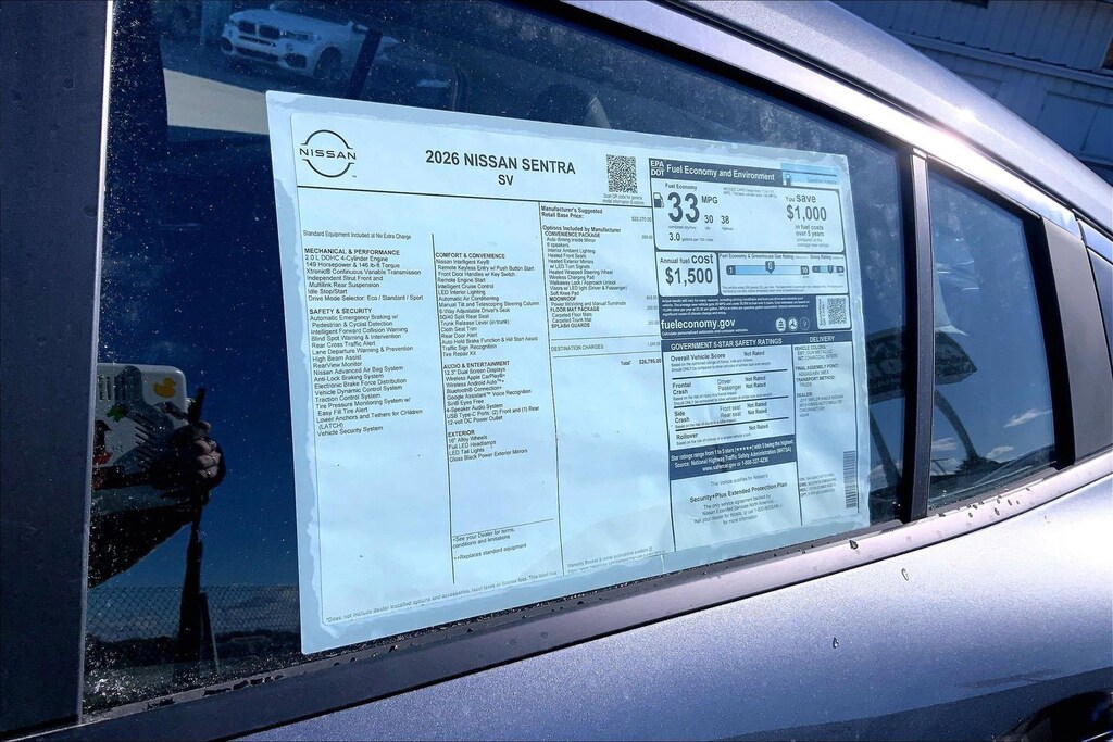 $1,992 off MSRP! Jeff Wyler Kings Nissan is proud to offer this charming 2026 Nissan Sentra SV in Gun Metallic. Well equipped with: Floor Mat Package, SV Convenience Package (6 Speakers, Ambient Lighting, Auto Diming Inside Mirror, Heated Exterior Mirrors, Heated Front Seats, Heated Steering Wheel, I-Key with Approach Unlock All Plus Walk Away Lock, Soft Knee Pad, Synthetic Leather Steering Wheel, Visor DR/AS w/LED Light, and Wireless Charging For Personal Devices), SV Moonroof Package (Power Tilt Sliding Sunroof with Manual Sunshade), CVT with Xtronic, Charcoal Cloth, 16" Machined Alloy Wheels, 4 Speakers, 4-Wheel Disc Brakes, ABS brakes, Air Conditioning, Alloy wheels, AM/FM radio: Sirius, Auto High-beam Headlights, Automatic temperature control, Body Colored Splash Guards (4-Piece), Brake assist, Bumpers: body-color, Delay-off headlights, Driver door bin, Driver vanity mirror, Dual front impact airbags, Dual front side impact airbags, Electronic Stability Control, Four wheel independent suspension, Front anti-roll bar, Front Bucket Seats, Front Center Armrest, Front reading lights, Fully automatic headlights, Illuminated entry, Knee airbag, Low tire pressure warning, Occupant sensing airbag, Outside temperature display, Overhead airbag, Overhead console, Panic alarm, Passenger door bin, Passenger vanity mirror, Power door mirrors, Power steering, Power windows, Premium Cloth Seat Trim, Radio data system, Radio: AM/FM with RDS/MP3, Rear anti-roll bar, Rear side impact airbag, Rear window defroster, Remote keyless entry, Security system, Speed control, Speed-sensing steering, Split folding rear seat, Steering wheel mounted audio controls, Tachometer, Telescoping steering wheel, Tilt steering wheel, Traction control, Trip computer, Variably intermittent wipers, and Wireless Apple CarPlay/Wireless Android Auto. 30/38 City/Highway MPGWyler Family First Package Includes: NanoCure Appearance Protection: Exterior & Interior Chemical Sealant Applied to Protect Against Environmental Hazards (7 Year Warranty Coverage). Pulse- Rear end Collision Avoidance System Theft Deterrent Strategy gives you 5 Years of Coverage against vehicle Theft, Offering up to a $5,000 benefit. Used vehicles 10 years of age or newer with less than 100,000 miles are eligible for the Wyler Assurance Program, but eligible vehicles must pass our reconditioning process and multi-point inspection. Provided the vehicle passes inspection, vehicles will be eligible for the 6 month/6,000 mile limited warranty. The 6 month/6,000 mile limited warranty is NOT available on AS-IS vehicles, wholesale vehicles, lease buyback/pass-thru vehicles or un-inspected vehicles. Note that this program can also apply to vehicles where the remaining factory coverage is less than 6 months or 6,000 miles. Please check the Federal Trade Commission (FTC) Buyers guide on the vehicle for full details as to whether or not warranty coverage may apply. Contact Dealer for additional details. The Wyler Assurance 6 month/6,000 Mile limited warranty ends 6 months from the date of the Retail Purchase Agreement (BUYERS ORDER) or when the vehicle's odometer registers 6,000 additional miles to the mileage listed on the BUYERS ORDER, whichever comes first. Your Deductible - The warranty holder on your contract pays the first $100 of each covered repair. Price includes: $500 - Nissan Customer Cash. Exp. 05/04/2026