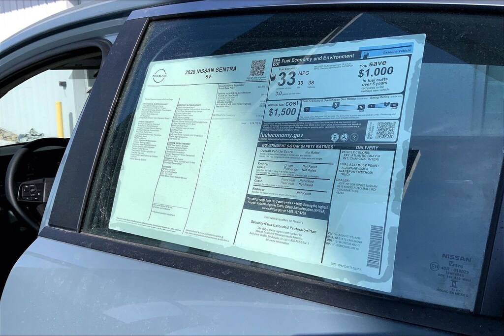 $1,894 off MSRP! Jeff Wyler Kings Nissan is pleased to offer this good-looking 2026 Nissan Sentra SV in Atlantic Gray Metallic. Well equipped with: Floor Mat Package, CVT with Xtronic, Charcoal Cloth, 16" Machined Alloy Wheels, 4 Speakers, 4-Wheel Disc Brakes, ABS brakes, Air Conditioning, Alloy wheels, AM/FM radio: Sirius, Auto High-beam Headlights, Automatic temperature control, Body Colored Splash Guards (4-Piece), Brake assist, Bumpers: body-color, Delay-off headlights, Driver door bin, Driver vanity mirror, Dual front impact airbags, Dual front side impact airbags, Electronic Stability Control, Four wheel independent suspension, Front anti-roll bar, Front Bucket Seats, Front Center Armrest, Front reading lights, Fully automatic headlights, Illuminated entry, Interior Door Scuff Protection, Knee airbag, Low tire pressure warning, Occupant sensing airbag, Outside temperature display, Overhead airbag, Overhead console, Panic alarm, Passenger door bin, Passenger vanity mirror, Power door mirrors, Power steering, Power windows, Premium Cloth Seat Trim, Premium Paint, Radio data system, Radio: AM/FM with RDS/MP3, Rear anti-roll bar, Rear side impact airbag, Rear window defroster, Remote keyless entry, Security system, Speed control, Speed-sensing steering, Split folding rear seat, Steering wheel mounted audio controls, Tachometer, Telescoping steering wheel, Tilt steering wheel, Traction control, Trip computer, Variably intermittent wipers, and Wireless Apple CarPlay/Wireless Android Auto. 30/38 City/Highway MPGWyler Family First Package Includes: NanoCure Appearance Protection: Exterior & Interior Chemical Sealant Applied to Protect Against Environmental Hazards (7 Year Warranty Coverage). Pulse- Rear end Collision Avoidance System Theft Deterrent Strategy gives you 5 Years of Coverage against vehicle Theft, Offering up to a $5,000 benefit. Used vehicles 10 years of age or newer with less than 100,000 miles are eligible for the Wyler Assurance Program, but eligible vehicles must pass our reconditioning process and multi-point inspection. Provided the vehicle passes inspection, vehicles will be eligible for the 6 month/6,000 mile limited warranty. The 6 month/6,000 mile limited warranty is NOT available on AS-IS vehicles, wholesale vehicles, lease buyback/pass-thru vehicles or un-inspected vehicles. Note that this program can also apply to vehicles where the remaining factory coverage is less than 6 months or 6,000 miles. Please check the Federal Trade Commission (FTC) Buyers guide on the vehicle for full details as to whether or not warranty coverage may apply. Contact Dealer for additional details. The Wyler Assurance 6 month/6,000 Mile limited warranty ends 6 months from the date of the Retail Purchase Agreement (BUYERS ORDER) or when the vehicle's odometer registers 6,000 additional miles to the mileage listed on the BUYERS ORDER, whichever comes first. Your Deductible - The warranty holder on your contract pays the first $100 of each covered repair. Price includes: $500 - Nissan Customer Cash. Exp. 05/04/2026